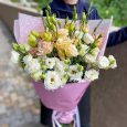 Букет белых эустом и роз с лимониумом