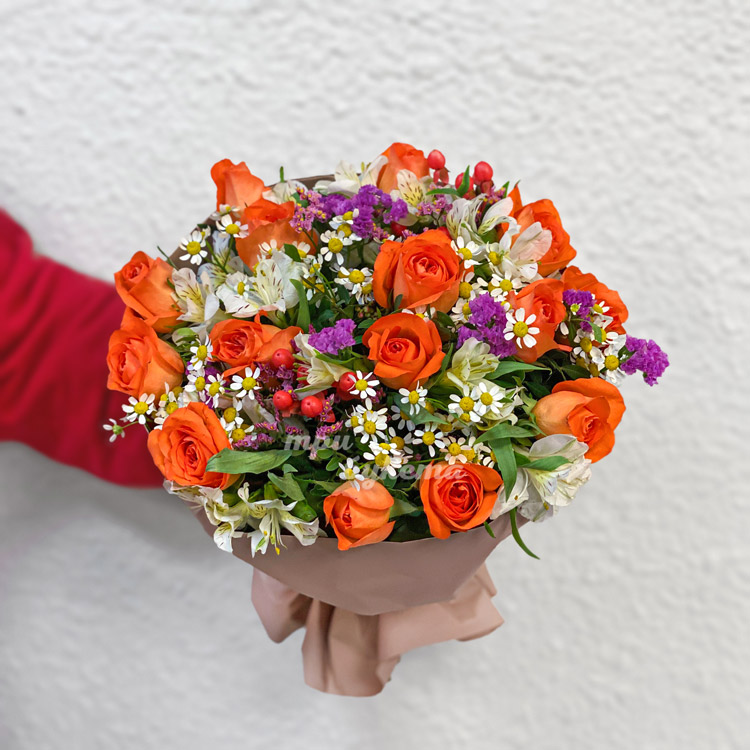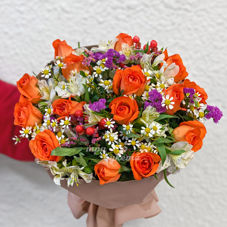 Букет оранжевых роз, альстромерий и зелени