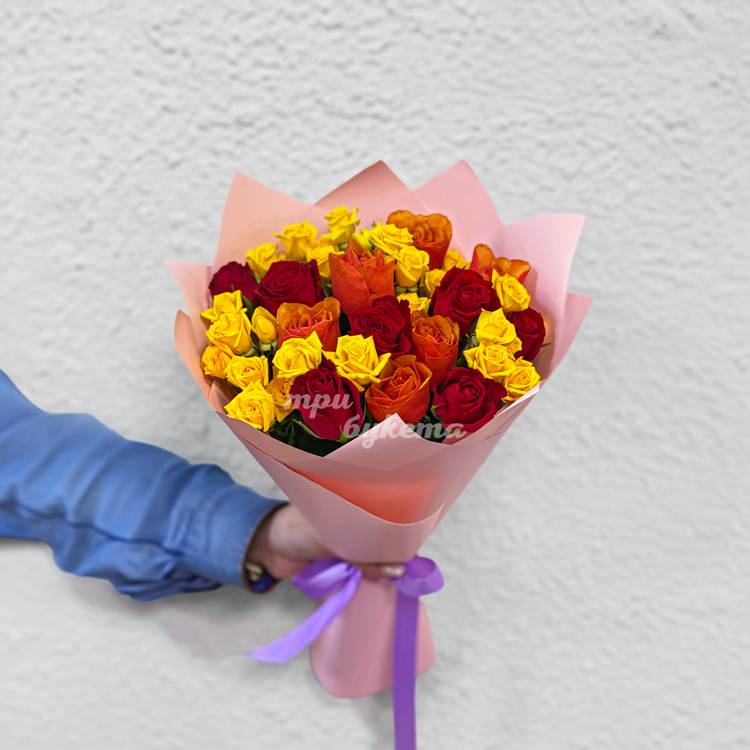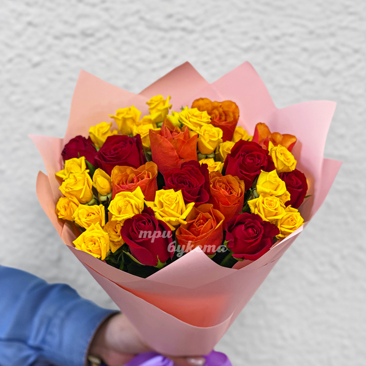 Букет желтых, красных и оранжевых роз