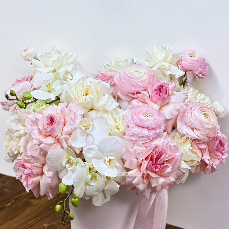 Коробка роз, ранункулюсов и орхидей