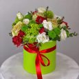 Коробка роз с зелеными хризантемами