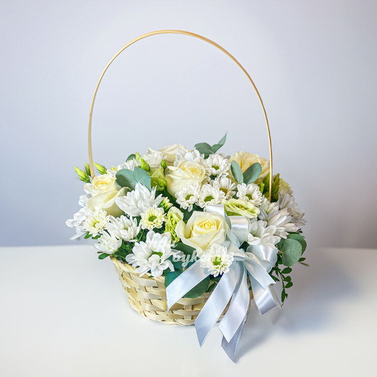 Корзина белых хризантем, эустом и роз