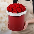 Пионовидные розы и эустомы в коробке