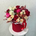 Пурпурные розы с гиперикумом в коробке