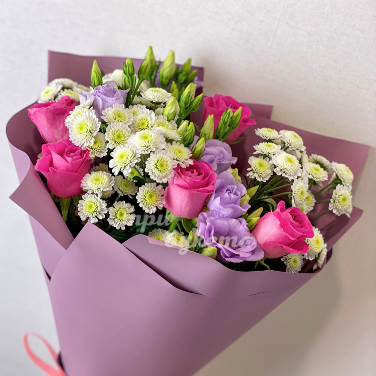 Розовые розы и кустовые хризантемы